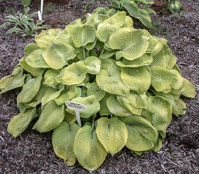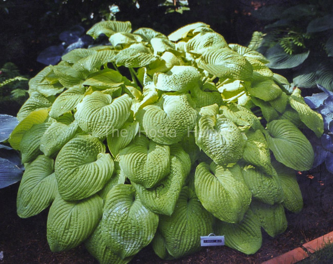Dr. Dick and Jane Ward of Ohio registered this large size (20 inches high by 53 inches wide) hosta with medium gold foliage in 2000. It is a hybrid of H. 'High Noon' × H. 'Noah's Ark'. The foliage his rounded, heavily corrugated and broadly ovate in shape. Pale lavender flowers bloom from late June into July.