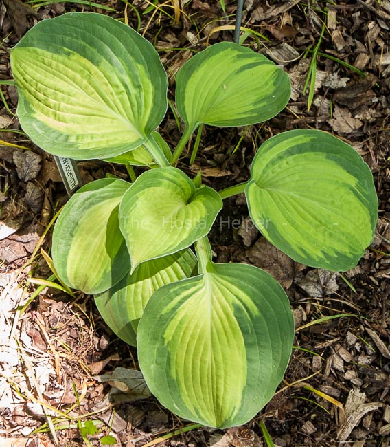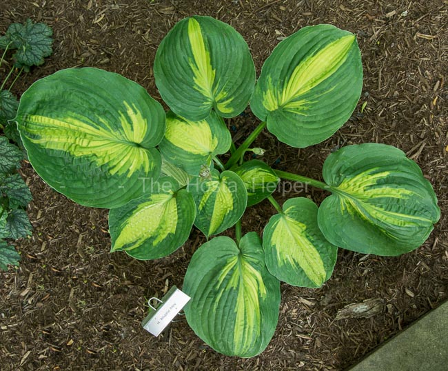 This tissue culture sport of H. 'Dick Ward' was registered by Walters Gardens, Inc. of Michigan in 2012. It grows to a medium size (16 inches high by 24 inches wide) with light green foliage that has a blue-green marginal variegation. The leaves are broadly ovate and moderately corrugated. The tubular, near-white flowers bloom from late June into July.