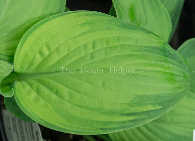 This sport of H. 'Guacamole' grows into a large size hosta about 24 inches tall by 54 inches wide. It was registered in 2016 by Bob Solberg of Green Hill Farm in North Carolina. A fast growing plant, 'Ambrosia' has medium blue-green foliage with a pale yellow medial (center) variegation. The leaves are slightly wavy, glaucous on top and have petioles which are pale yellow in the center. The flowers are pale lavender and bloom from mid-July into August on scapes up to 41 inches tall.