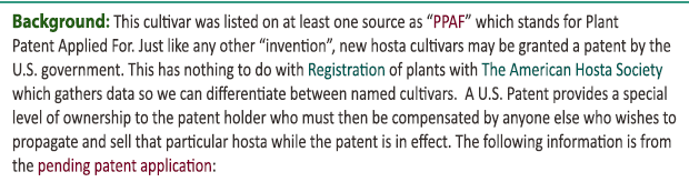 The patent application lists the following as differences from the mother plant: "In the new Hosta, the leaf margin is blue due to the presence of a glaucous wax as compared to the dark green margin of Hosta 'Guacamole' which has no wax. The leaf center of the new Hosta is a light yellow due to the presence of a glaucous wax as compared to the yellow/chartreuse center of Hosta 'Guacamole' which has no wax."