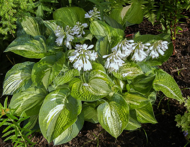 The New Encyclopedia of Hostas by Diana Grenfell (2009) states in its Hosta Hybrids for Connoisseurs chapter: "Although very slow to increase, shows potential vigor. Makes a superb border specimen. Needs regular division of the clump to maintain the most pleasing balance between the leaf blade and margin. Still very rare...Embroidered, crimped puckering, particularly on the leaf margin of mature plants. Some misting or speckling into the center of the leaf blade on young leaves."