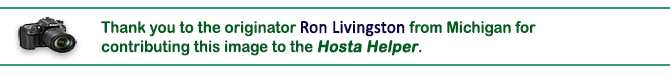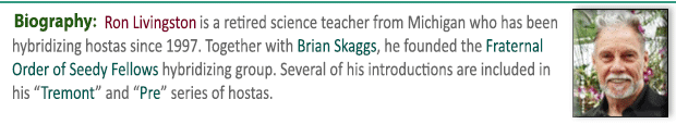This non-registered cultivar from Ron Livingston of Michigan is a hybrid of H. 'Ginko Craig'× H. 'Chartreuse Wiggles'. It grows into a miniature size hosta only 5 inches in height by 16 inches wide with wavy, gold leaves.