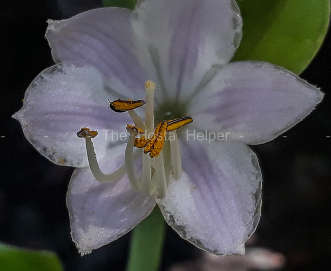 and slightly shiny on top. Pale lavender, tubular flowers bloom