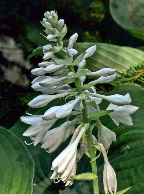An article about favorite flowering hostas by W. George Schmid in The Hosta Journal (2006 Vol. 37 No. 2) says, "The best flowers are on H. plantaginea and its multi-petalous cousins, 'Venus' and 'Aphrodite'...H. capitata in bud is fine, but its offspring, 'Nakaimo' has flowers that begin with the shine of precious porcelain and stay closed in bud longer...H. kikutii forms all have fine and late flowers, but the best are on H. kikutii densa (H. densa). They are white and form a tight bunch at the top of the scape. H. laevigata has large, spidery flowers in abundance; its cousin H. yingeri has smaller ones with the same spidery character and dark color. These spidery flowers are carried all around the stem unlike other hosta flowers that, "lean to one side...Finally, mature clumps of 'Blue Angel' and 'Elegans' have a beautiful flower display when many flowers on different scapes open in unison..."