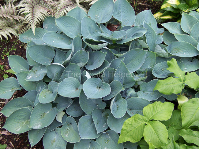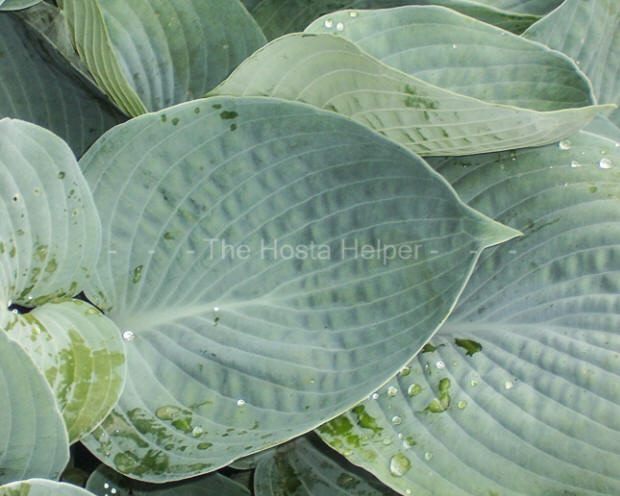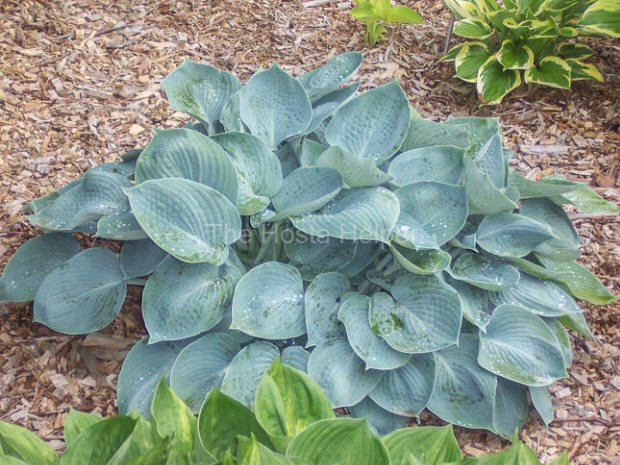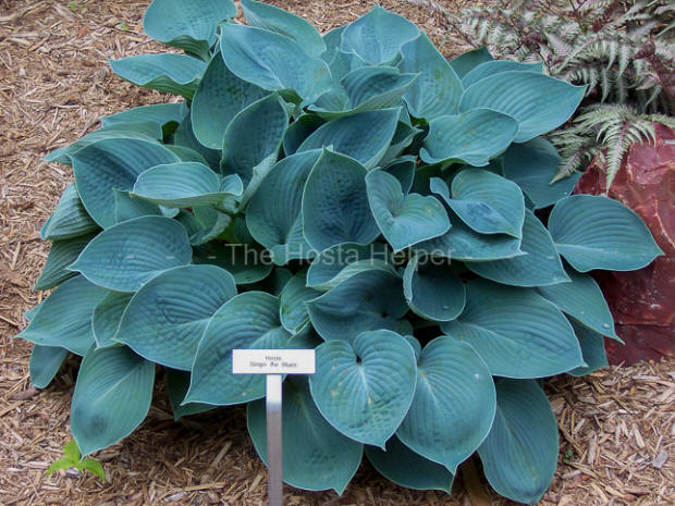 In size and physical characteristics, slightly larger than ‘Halcyon’ (3’ wide) with very lightly puckered heart-shaped leaves.  ‘Blue Challenger’ needs some afternoon shade to preserve its frosty blue, blue color. Parentage: 'Halcyon' X OP