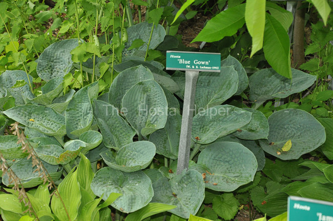 A cultivar of unidentified parentage, this plant was registered by Wm and Eleanor Lachman of Massachusetts in 1992. It forms a large size mound of heavily corrugated foliage and bears funnel shaped, near white flowers in mid-June.