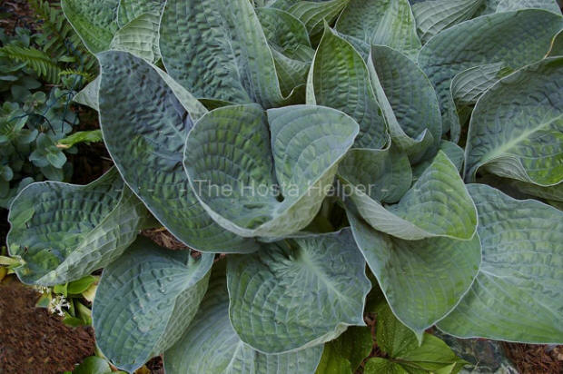 Frosty blue leaves are cupped and heavily corrugated. White flowers in early summer on this beautiful medium-large hosta.