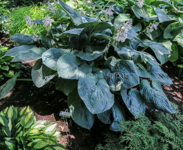 Hosta Journal (2000 Vol. 31 No. 1) states that, "H. 'Blue Mammoth'...The hosta's name has blue in it, but the leaf looks mighty green in