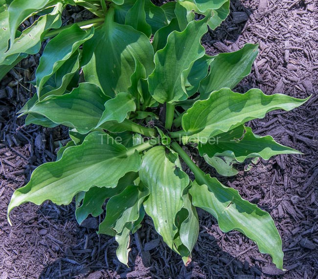 This cultivar is a hybrid of "Avent Seedling PDN 99-094" x H. 'Pewterware' which was registered by Tony Avent of Plant Delights Nursery in North Carolina in 2012. It is a medium size plant about 18 inches high by 48 inches wide with dark green foliage. The leaves are slightly rippled, broadly ovate, slightly wavy and very shiny on top. Near white, bell-shaped flowers bloom on branched flower scapes from mid-July into September.  It sets viable seeds.
