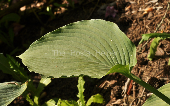 This is a non-registered cultivar from a seedling selection by Van Wade of Wade and Gatton Nursery (Closed 2019) of Ohio. The plant forms a large size mound of rippled foliage. It bears near-white flowers in early summer.