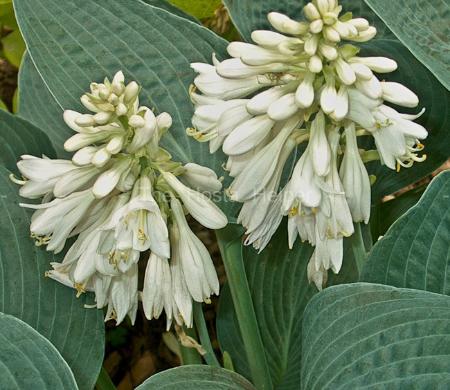 and moderately corrugated foliage. It has pure white flowers that appear in July to
