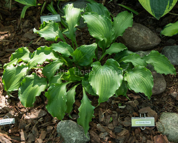 wide) hosta is heavily rippled, slightly wavy, very shiny on top
