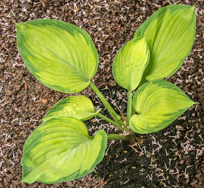 Originated by Kathie Sisson of Connecticut, this non-registered cultivar is sport of H. 'Fat Cat'. It is a giant size hosta with corrugated, green foliage that has a golden-yellow medial (center) variegation.