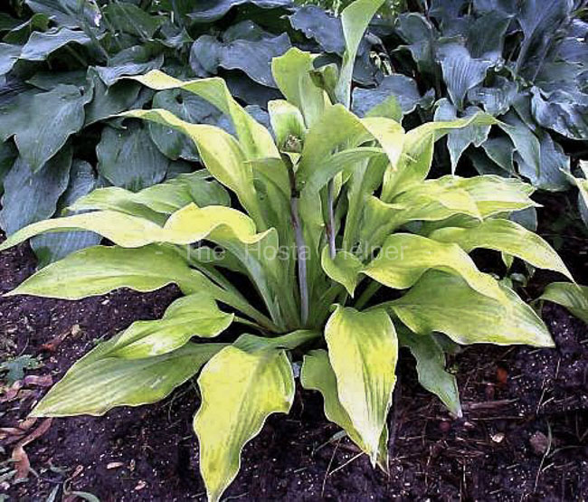This cultivar is a non-registered hosta of unidentified parentage from Ron Livingston of Michigan. It has wavy golden colored foliage with dark purple petioles and a semi-upright growth habit.