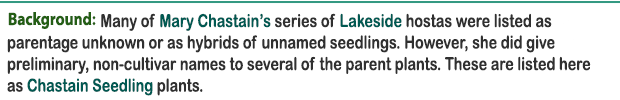 Breeding plant used by Mary Chastain of Tennessee. It was the pod and pollen parent of H. 'Lakeside Coal Miner'.