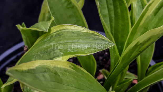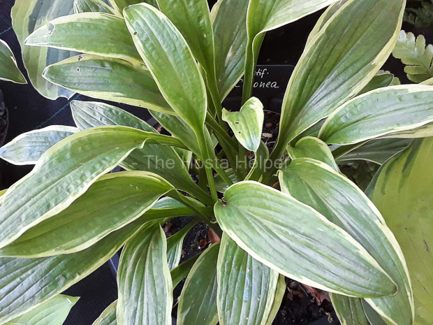 This plant which grows into a small size hosta about 10 inches high by 24 inches wide came from Japan. It has green leaves with white marginal variegation. The foliage is cupped either upwards or downwards. It has purple flowers.