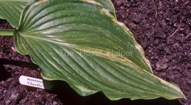 An article about H. montana 'Chirifu' by Herb Benedict in The Hosta Journal (1991 Vol. 22 No. 2) states that, "About seven years ago, on one of her biannual trips to Japan, Hideko Gowen of Excelsior, Minnesota, brought back a very beautiful large gold-splashed form of Hosta montana. It was found in the wild by Mr. Sekini, in Tachigi Ken, Japan. George Schmid has suggested the name H. montana 'Chirifu'. Chirifu is a Japanese word which means "splashed" or "overall-variegated...The bloom stalks are well over six feet tall each with forty or more very fertile flowers."