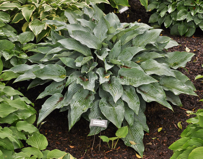 A Photo Essay article by Steve Chamberlain in The Hostta Journal (2010 Vol. 41 No. 1) makes comments about H. 'Deane's Dream', "Bob Solberg registered this cross between 'Blue Arrow' and 'Sea Fire' in 2000. It is a vigorous blue hosta in the garden. The light blue leaves hold their color well, at least until the plant blooms."
