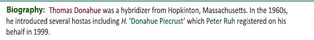 The Hosta Handbook by Mark Zilis (2000), "...'Donahue Piecrust' has the reputation of being the