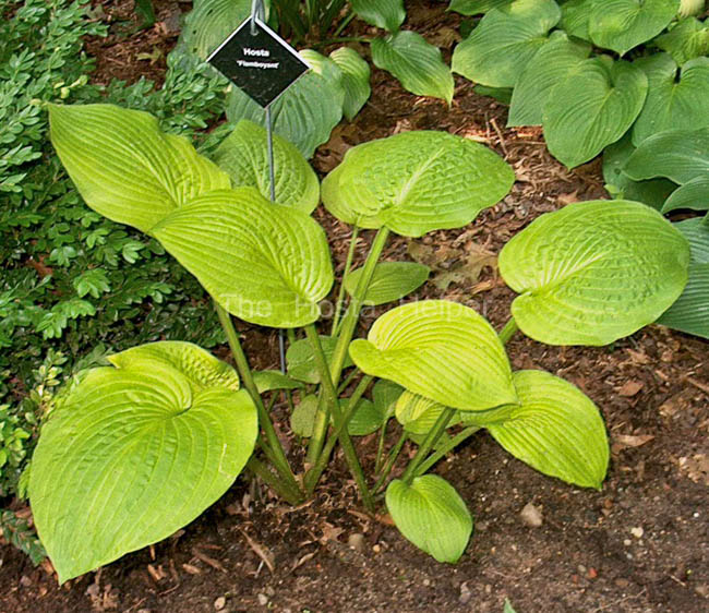 This cultivar is considered unstable and may revert into the plain, light green plant shown above or into a creamy/yellow medially (center) variegated cultivar H. 'Shade Fanfare'.