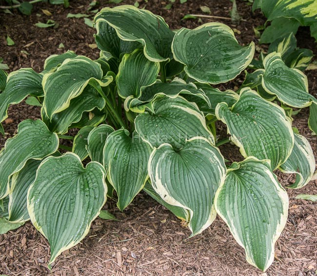 This hybrid of H. 'Christmas Tree' × H. 'Donahue Piecrust' was originated