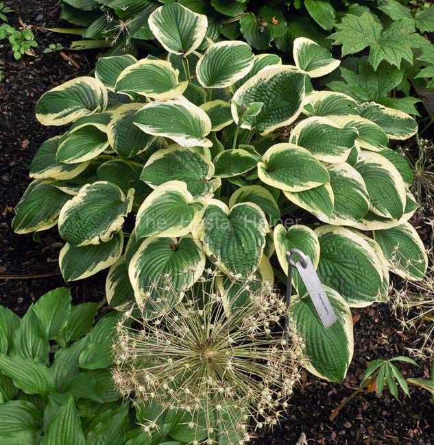This large size (26 inches high by 60 inches wide), marginally variegated hosta produces pale lavender flowers in mid-August. The leaves are moderately corrugated and somewhat wavy. It is a seedling of H. 'Breeder's Choice' × H. 'Frances Williams' that was registered by Dr. Kevin Vaughn of Massachusetts in 1988.