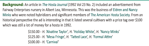 A catalog advertisement from Fairway Enterprises (Eldren and Nancy Minks) in Minnesota in The Hosta Journal (1994 Vol. 25 No. 1) offered the following hostas (among others): 'Banana Flip' - $100.00, 'Candle Glow' - $100.00, 'Coventry' - $100.00, 'Formal Attire' - $100.00, 'Holiday White' - $100.00, 'Mesa Fringe' - $100.00, 'Nancy Minks' - $150.00, 'Prince Albert' - $100.00, and 'Royal Highness' - $100.00.