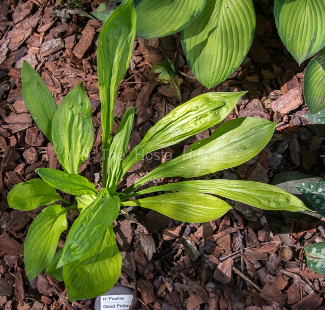 This non-registered cultivar is a sport of H. 'Foxfire Palm Sunday' from