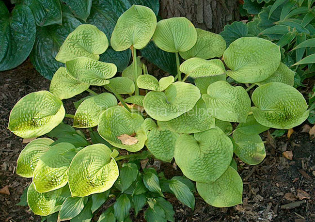 Paul Aden of New York registered this cross of H. 'Tokudama Aureonebulosa' × H. 'Golden Prayers' in 1978. Growing into a medium size (18 inches high) mound, it has heavily corrugated leaves that have thick substance. Near white flowers appear from late June into July.