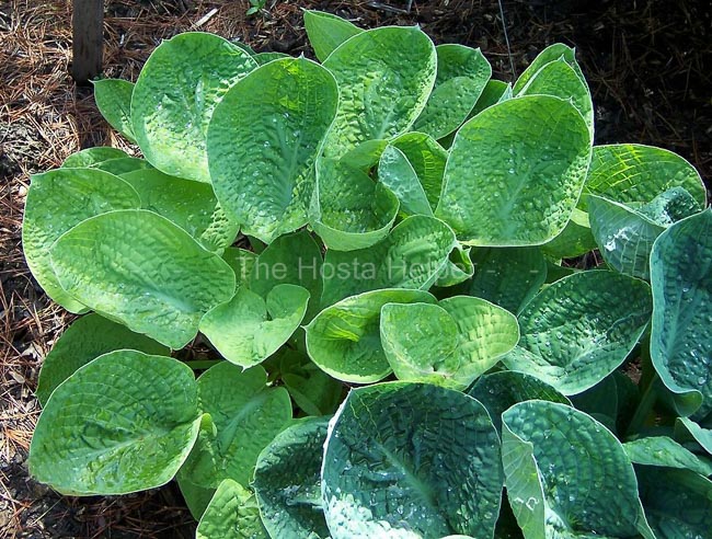 Intensely corrugated, bright gold leaves are nicely cupped. White flowers mid-season on this medium-size hosta.