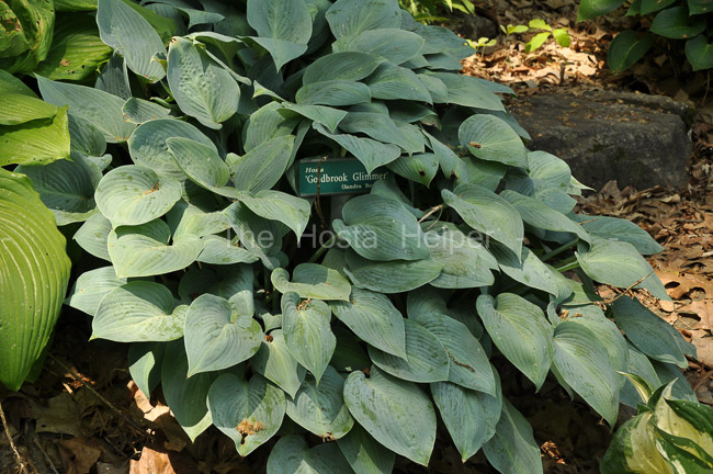 An article about the Halcyon Group by Peter Cross in The Hosta Journal (2004 Vol. 35 No.2) says, "...'Halcyon' is a first-generation member (TF 1 × 7) of the legendary Tardiana Group of hostas, which consists of hybrids of 'Tardiflora' × H. 'Elegans', produced in England by Eric Smith,  the master hybridizer of blue hostas, in the 1960s....The first sport...was aptly named 'Goldbrook Glimmer', discovered by Sandra Bond of Goldbrook Plants in England...features a narrow "glimmer" or blaze of green down the middle of the blue leaves...The variegation is most pronounced in cooler climates and early in the season...In especially warm climates, the mound will appear a solid blue by the end of the summer."