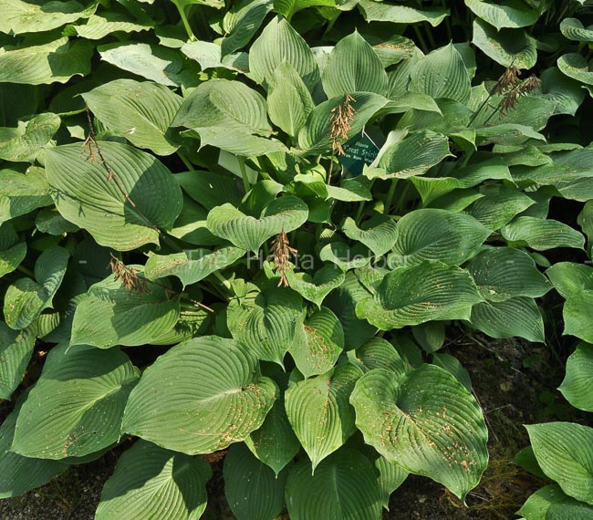 This sport of H. 'Valentine Lace' was originated by Charles Isaacs of Moongate Farm in North Carolina. It grows into a medium size hosta at a height of around 14 inches with a width of 24 inches. The green leaves have a medium blue-green marginal variegation. Its tubular shaped flowers bloom in June.
