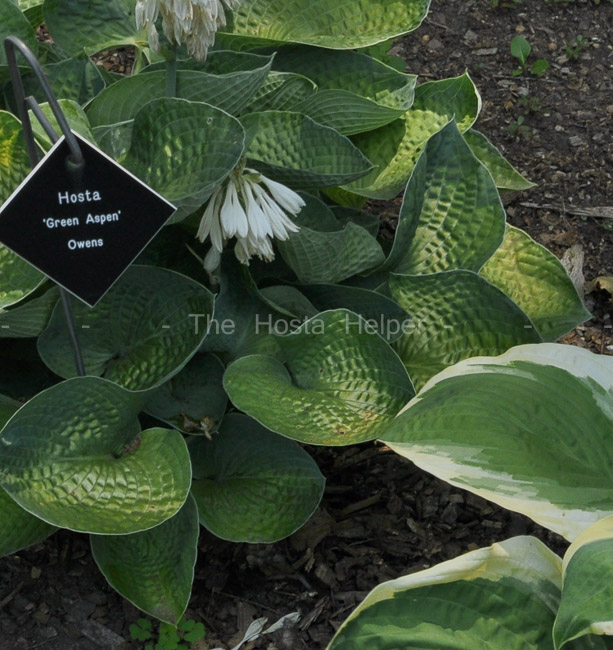 This self-pollinated seedling of H. 'Aspen Gold' was registered by Clarence Owens of Michigan in 1986. The large size mound grows to about 21 inches in height with a spread of around 44 inches. Its foliage begins the season as a bluish-green color changing to a dark green by fall. The leaves are moderately cupped and heavily corrugated. Near white flowers bloom in July.