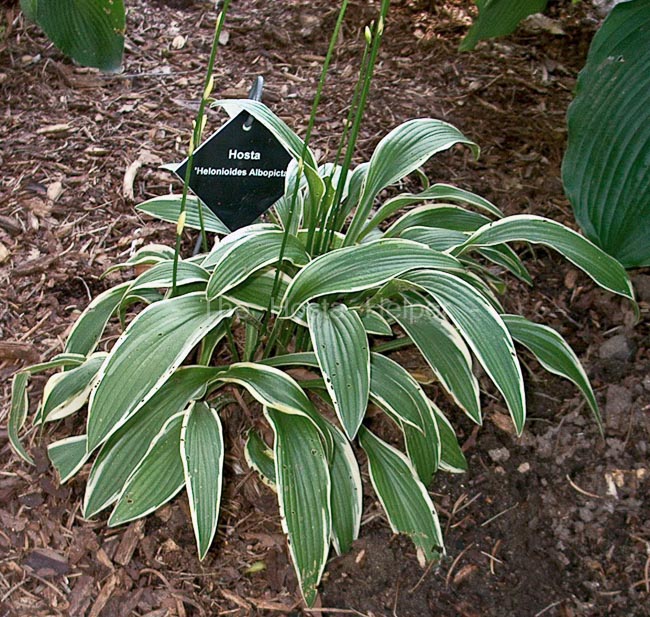 The Hosta Handbook by Mark Zilis (2000) believes that it is the same plant as the classic H. 'Ginko Craig' while the plant that was sold in the U.S. for many years as H. heloniodes albo-picta is actually H. rodefolia.