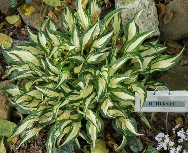 centered, lanceolate and twisted leaves. 'Hideout' bears pale purple flowers in July.