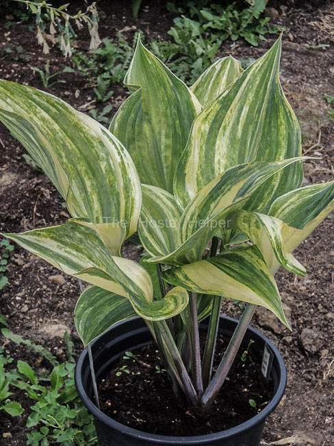Originated in 2019 by Ronny Van Keer of Belgium, this non-registered cultivar is a hybrid of H. 'Holar Rainbow Colors' × H. 'Mr Blue'. It is a medium size hosta with green colored foliage with streaked variegation. The leaves have rose red petioles.