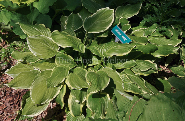Oops! Sure looks as if this big hosta is labeled as H. 'Holiday White'. Unfortunately, the actual 'Holiday White' is a small size mound of white-centered, green-margined foliage. We will try to get a true picture next summer.