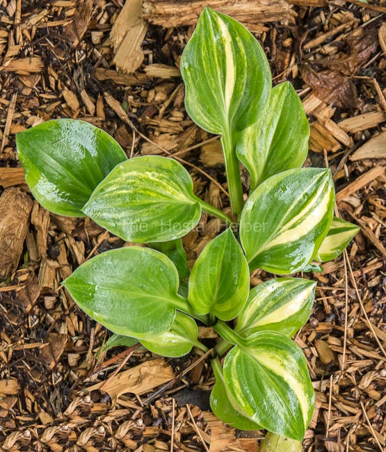 This is a streaked form of H. 'Ice Cream'...so the label says. The leaves are slightly convex, oval to round and have a distinct tip. This medium size (15 inches high) plant has lavender flowers in late July.