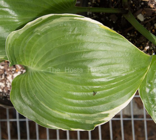 white marginal variegation. Its leaves are broadly ovate, slightly cupped, slightly folded, slightly wavy and slightly shiny