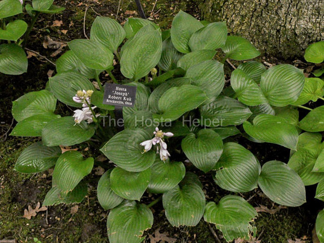 An article by Warren I. Pollock in The Hosta Journal (1997 Vol. 28 No. 2) states that, "Bob Kuk named this plant for his mother...H. 'Josephine' is relatively unstable. It sports to two different hostas. One has leaves that are all green that he named 'Joseph' after Joe Duale, his stepfather...The other sport he named 'Queen Josephine'...it has green leaves with a wide margin, yellow when it emerges and then becoming creamy white. There is often some slight streaking of the margin toward the midrib...Both 'Joseph' and 'Queen Josephine' are exceptional in that they have very shiny, glossy leaves."