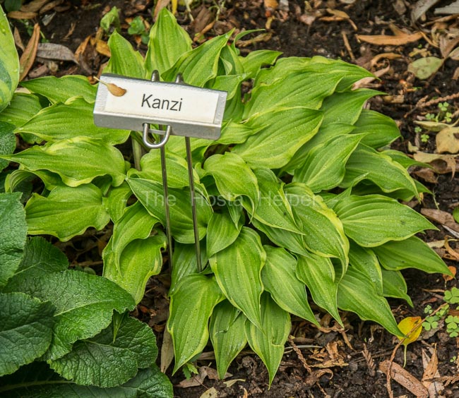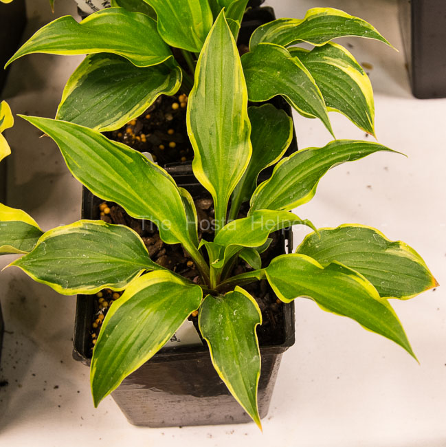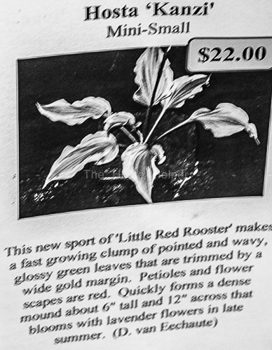 of H. 'Little Red Rooster'. Its foliage is lanceolate and green with a wide yellow marginal