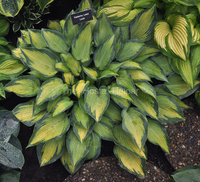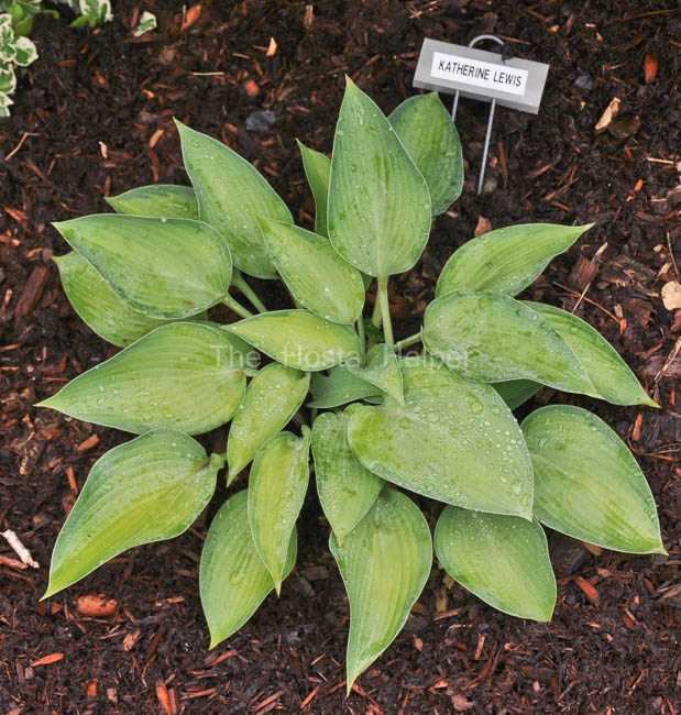 An article by Warren I. Pollock in The Hosta Journal (2002 Vol. 33 No. 1) quotes English nurseryman Roger Bowden "We obtained some plants from Terra Nova Nurseries (Tigard, Oregon), and the labels with them spelled H. 'Kathryn Lewis'. We had some plants from Alan Lewis labeled H. 'Katherine Lewis' and upon enquiry Alan confirmed that his spelling of his daughter's name was correct! Alan Lewis had a nursery incorporated in the grounds of Forde Abbey near Chard in Somerset..."