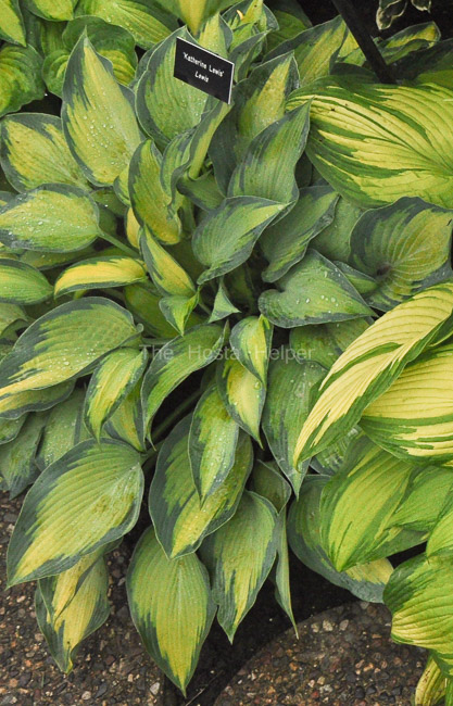 According to The Hostapedia by Mark Zilis (2009), "...named this cultivar for his daughter...For a few years, this was mistakenly listed by a few nurseries as 'Kathryn Lewis'. It is quite similar to 'June', except for the leaf center, which becomes a brighter gold as the season progresses."