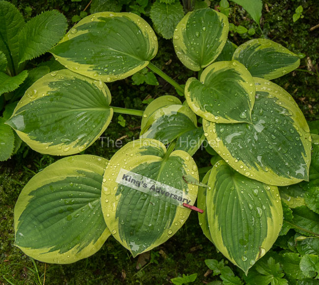 This is an upright, large size hosta with corrugated, blue-green leaves and creamy yellow marginal variegation. It is a hybrid of H. 'Adversary' and is a non-registered cultivar originated by Herb and Gladys King of Wisconsin.
