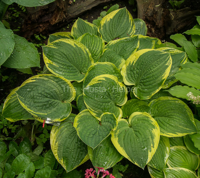 Originated by Herb and Gladys King of Wisconsin, this large size hosta is a non-registered cultivar of unidentified parentage. The slightly corrugated, nearly round leaves are green with a yellow marginal variegation.