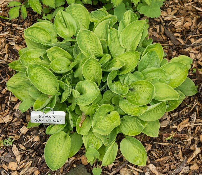 Originated by Herb and Gladys King of Wisconsin, this non-registered cultivar is of unidentified parentage. It is a small size plant with slightly unruly, slightly corrugated, slightly cupped, light green foliage.
