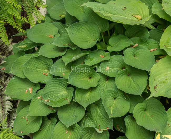 Originated by Herb and Gladys King of Wisconsin, this medium size, non-registered cultivar is of unidentified parentage. It has heart-shaped dark green foliage that is slightly corrugated.