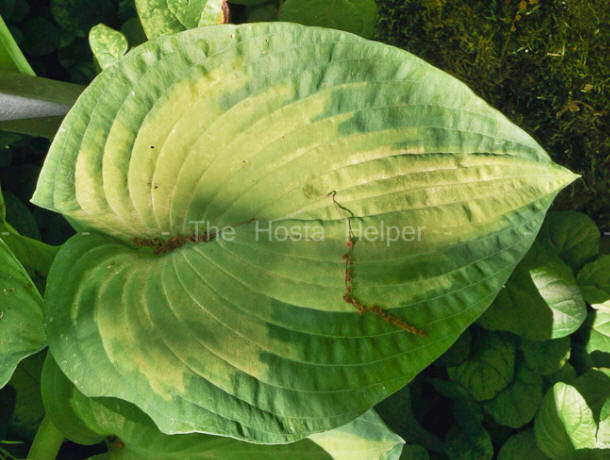 golden-yellow medial (center) variegation. The foliage is broadly ovate,