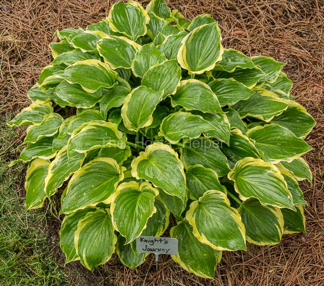 This cultivar is a sport of H. 'Chivalry' which was registered by Alex Malloy of New York in 2002. A medium size hosta, 'Knight's Journey' has green foliage with a white marginal variegation. Lavender flowers bloom from mid-July into August.