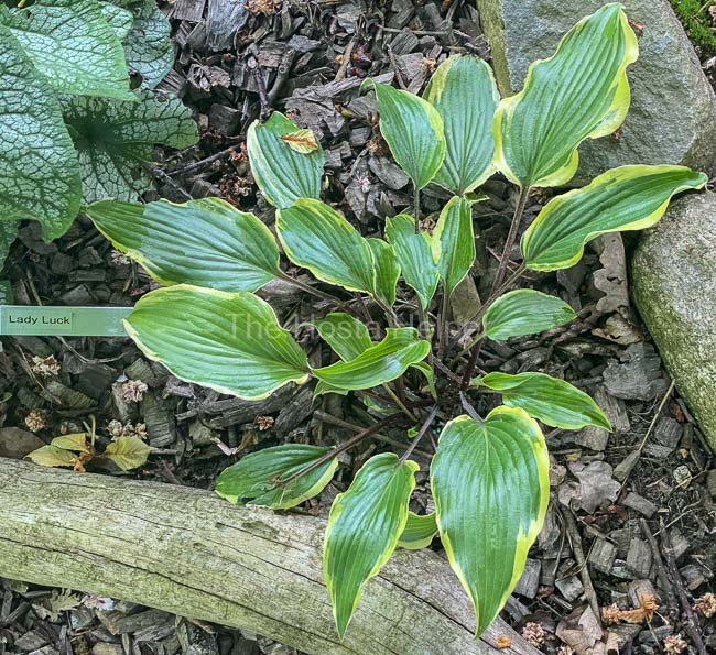 inches wide) sport of H. 'Lady Gaga' in 2014. The medium green foliage has creamy white marginal